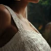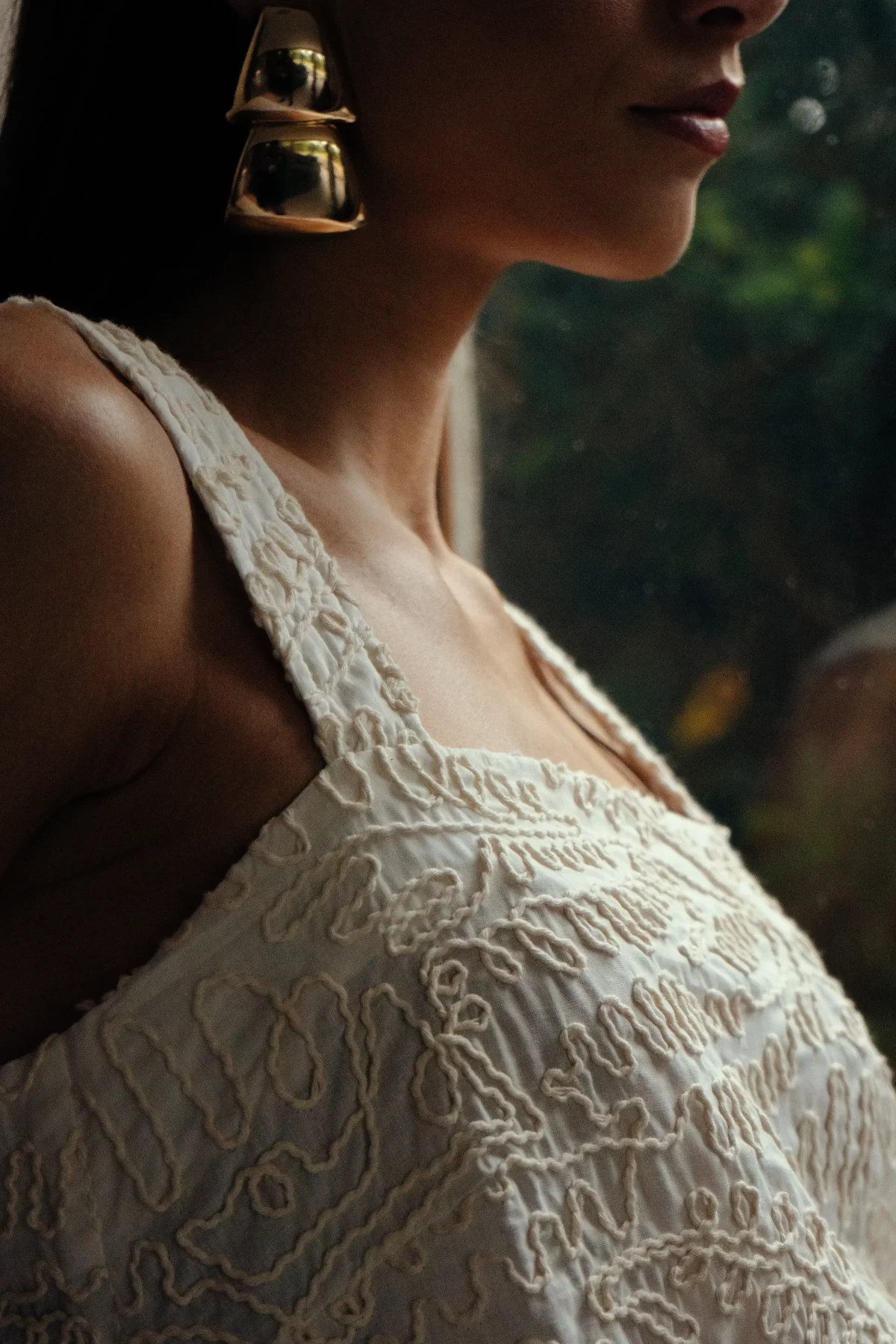 Blusa em algodão bordado com corte reto, decote reto, alças largas, comprimento longo e fendas laterais. Não possui abertura.