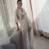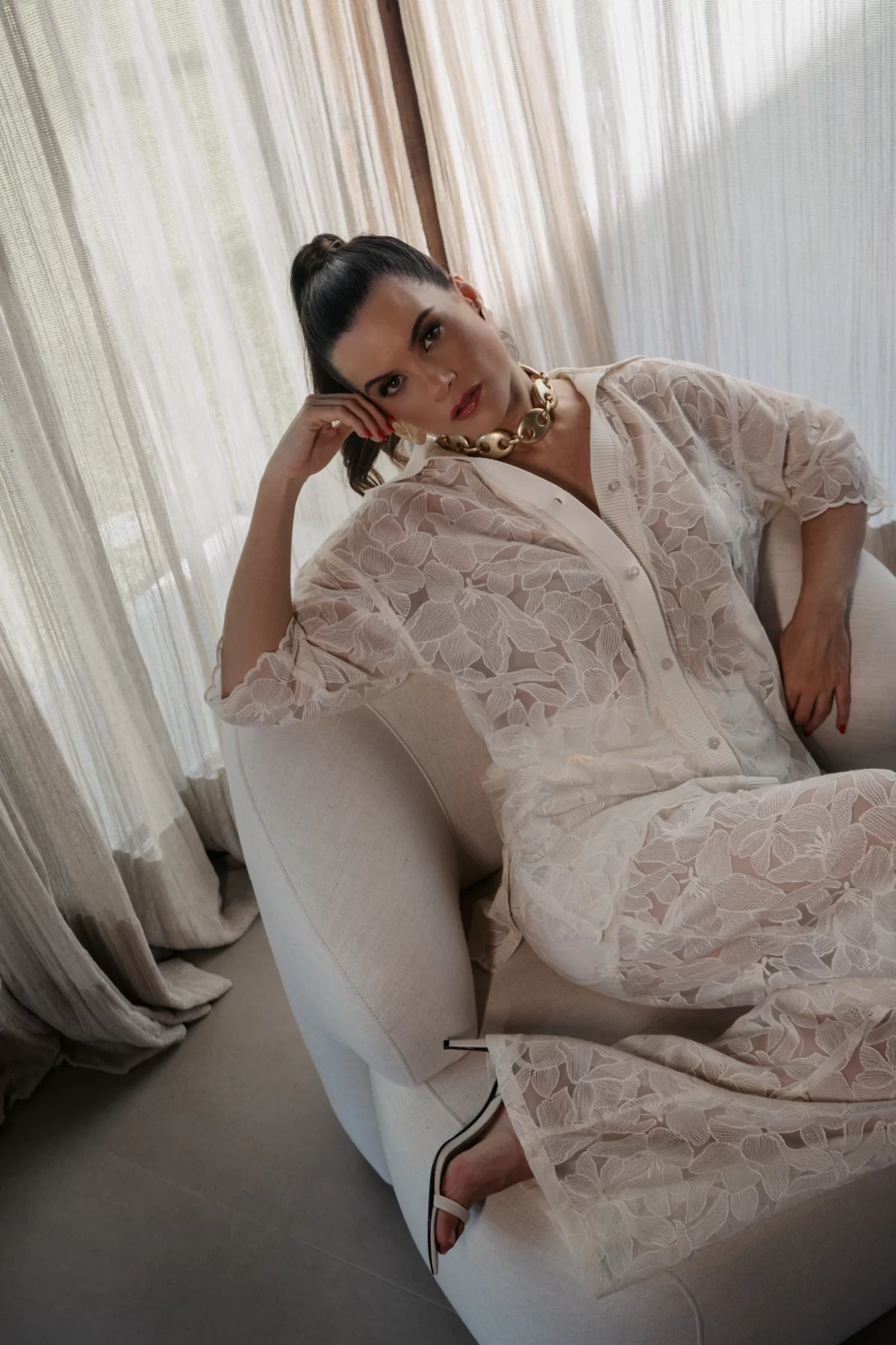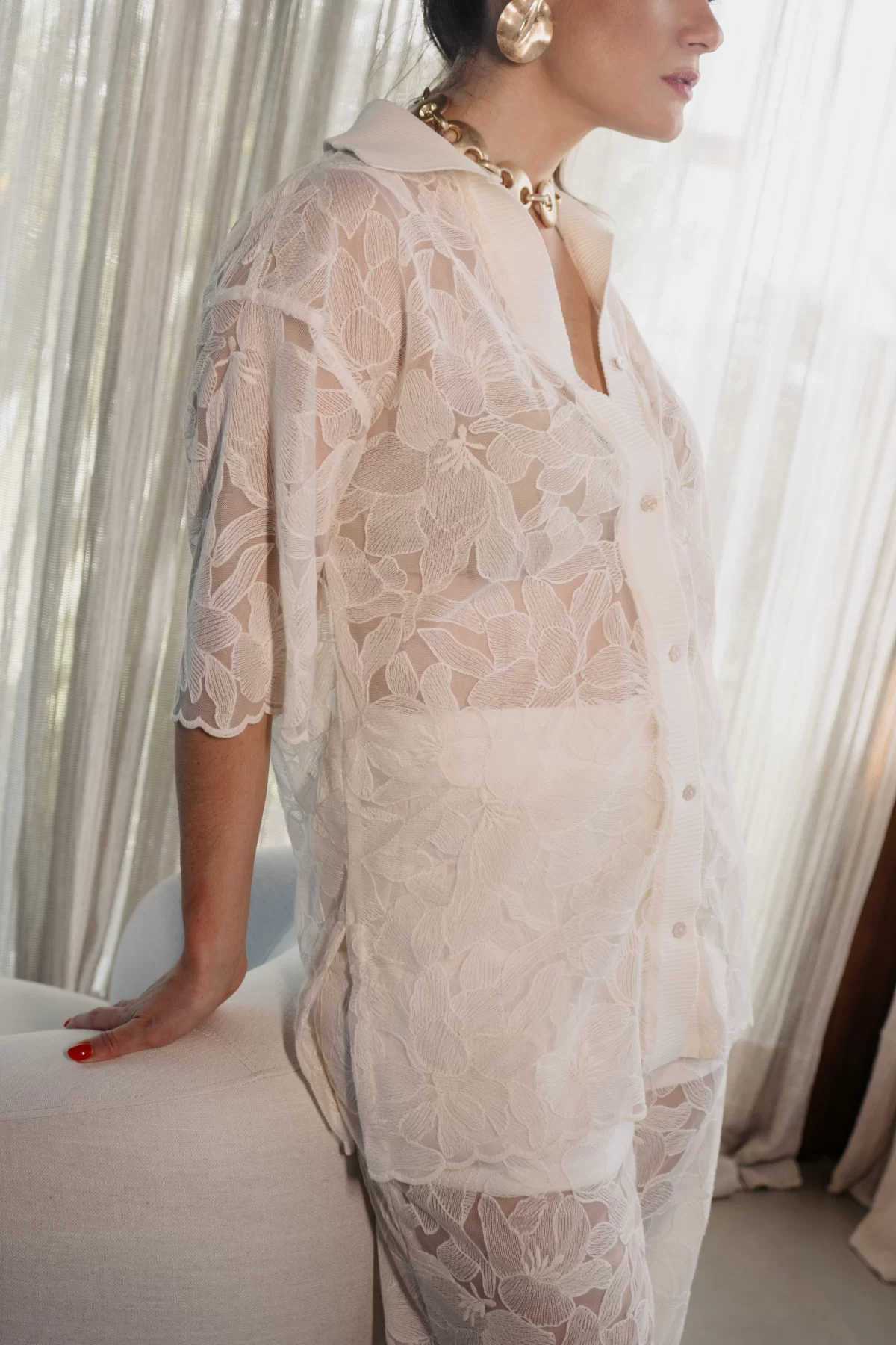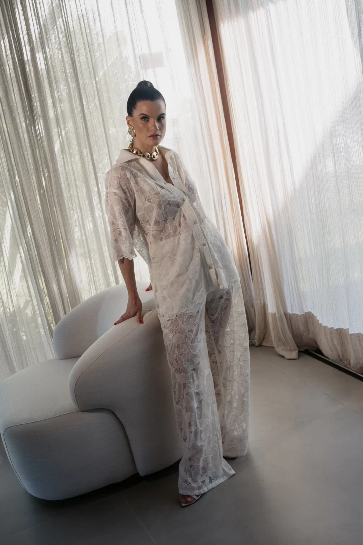 Calça em guipuir de renda bordada com corte reto, comprimento longo, forro curto, cós regular com zíper e botão em madrepérola.