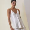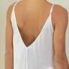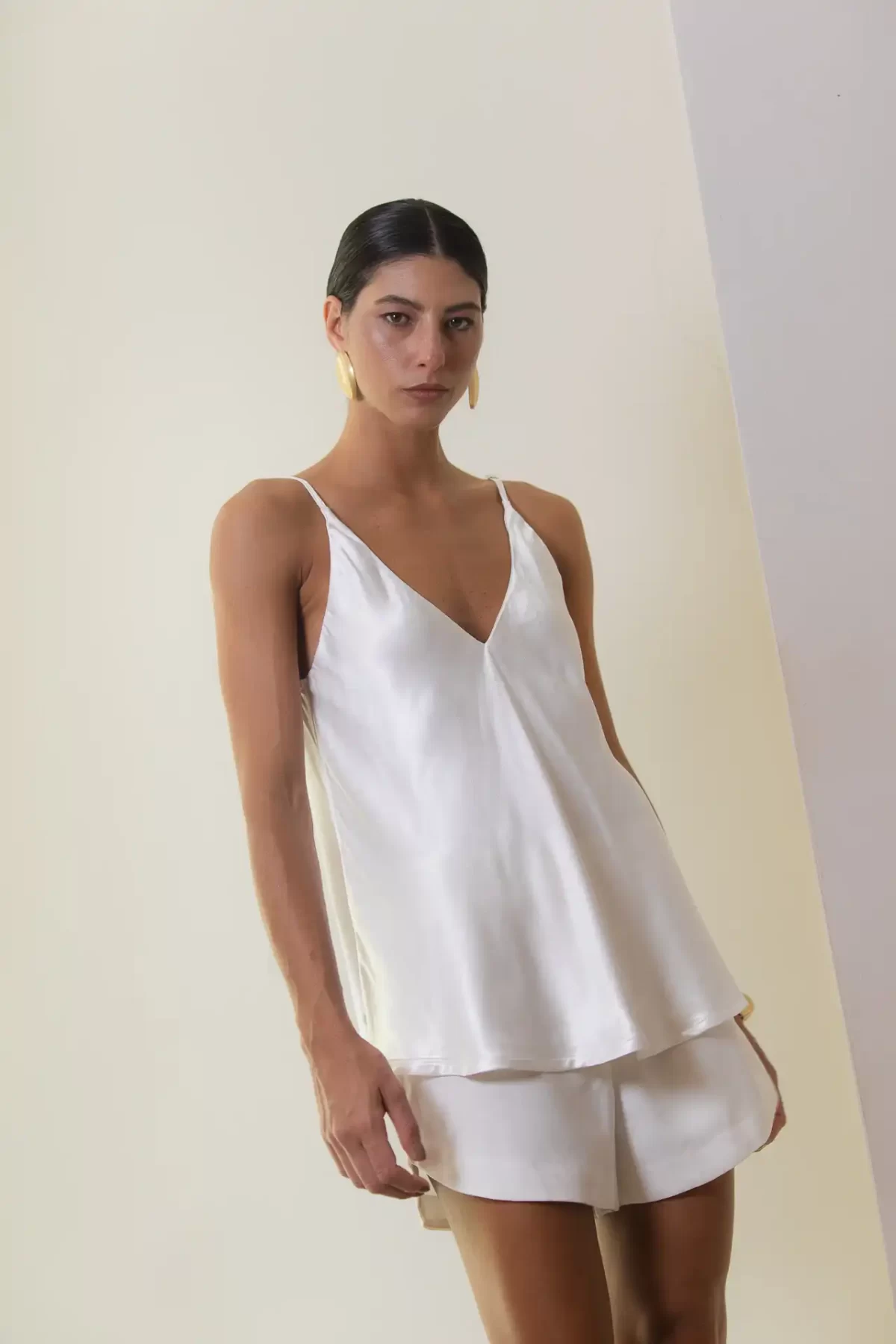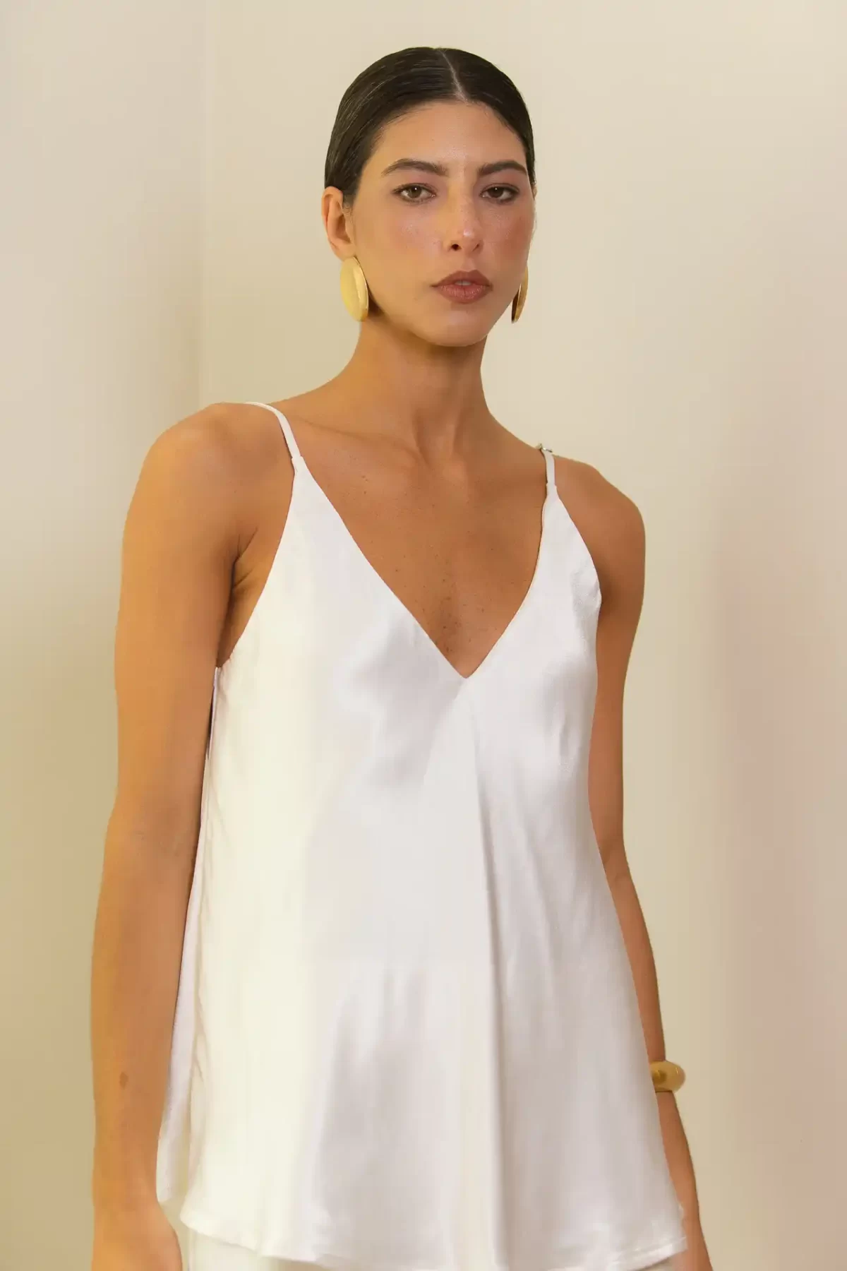 Blusa em cetim de viscose com tecido duplo na parte da frente evitando transparência, corte em viés que proporciona modelagem solta, comprimento longo, decote em V na frente e atrás e alças finas com reguladores.