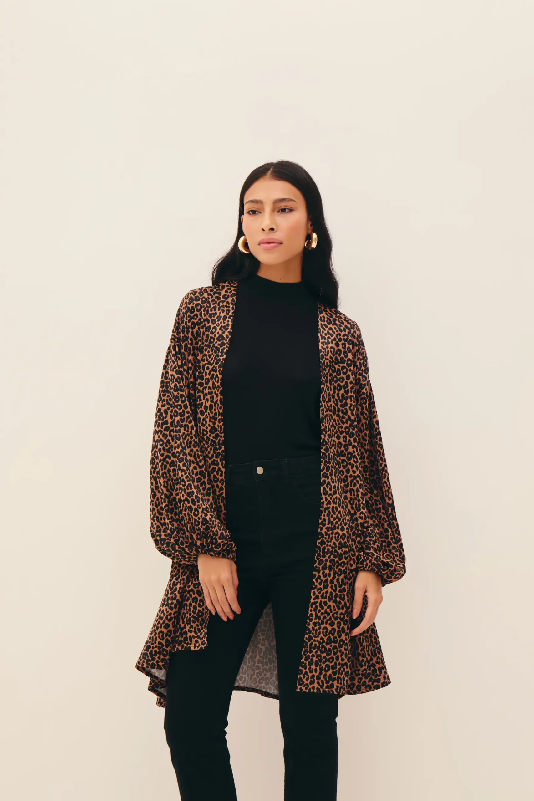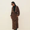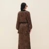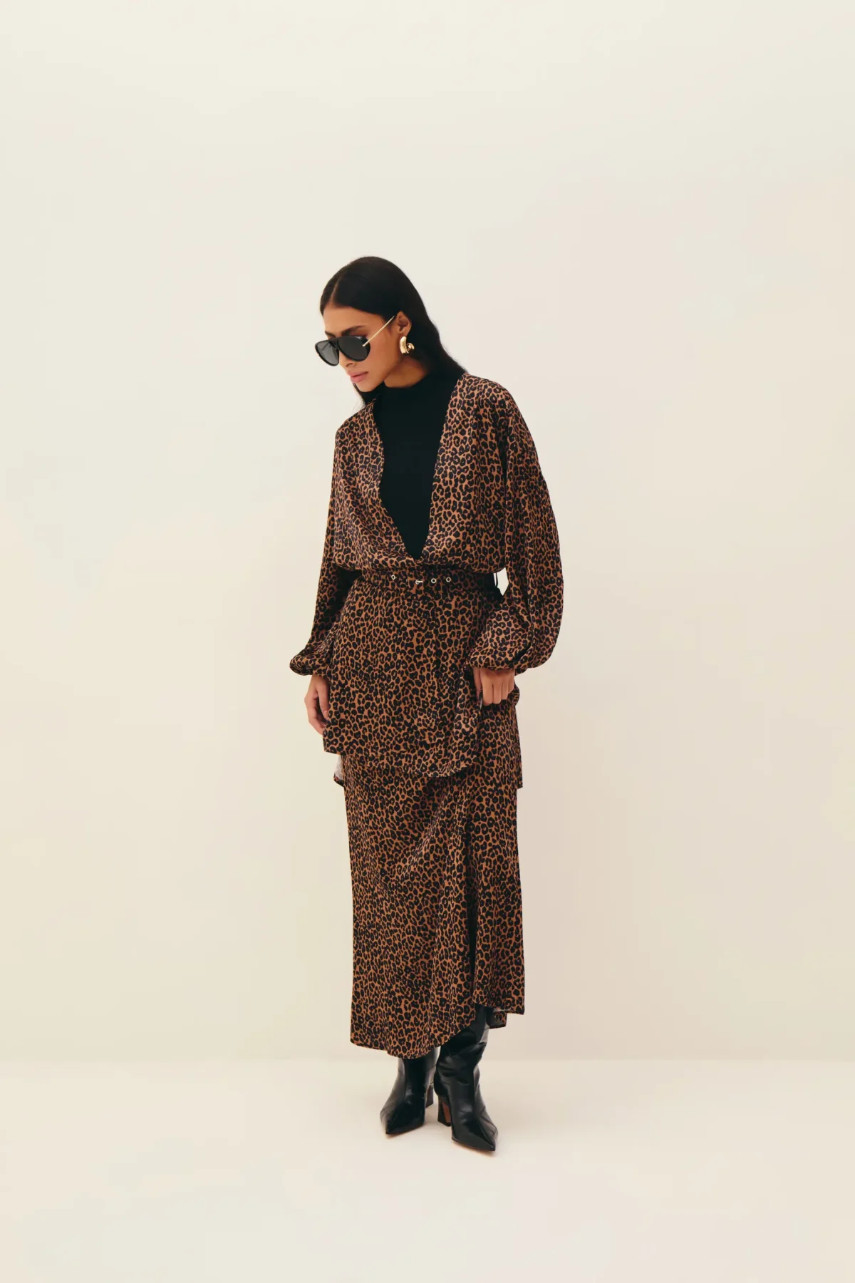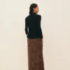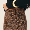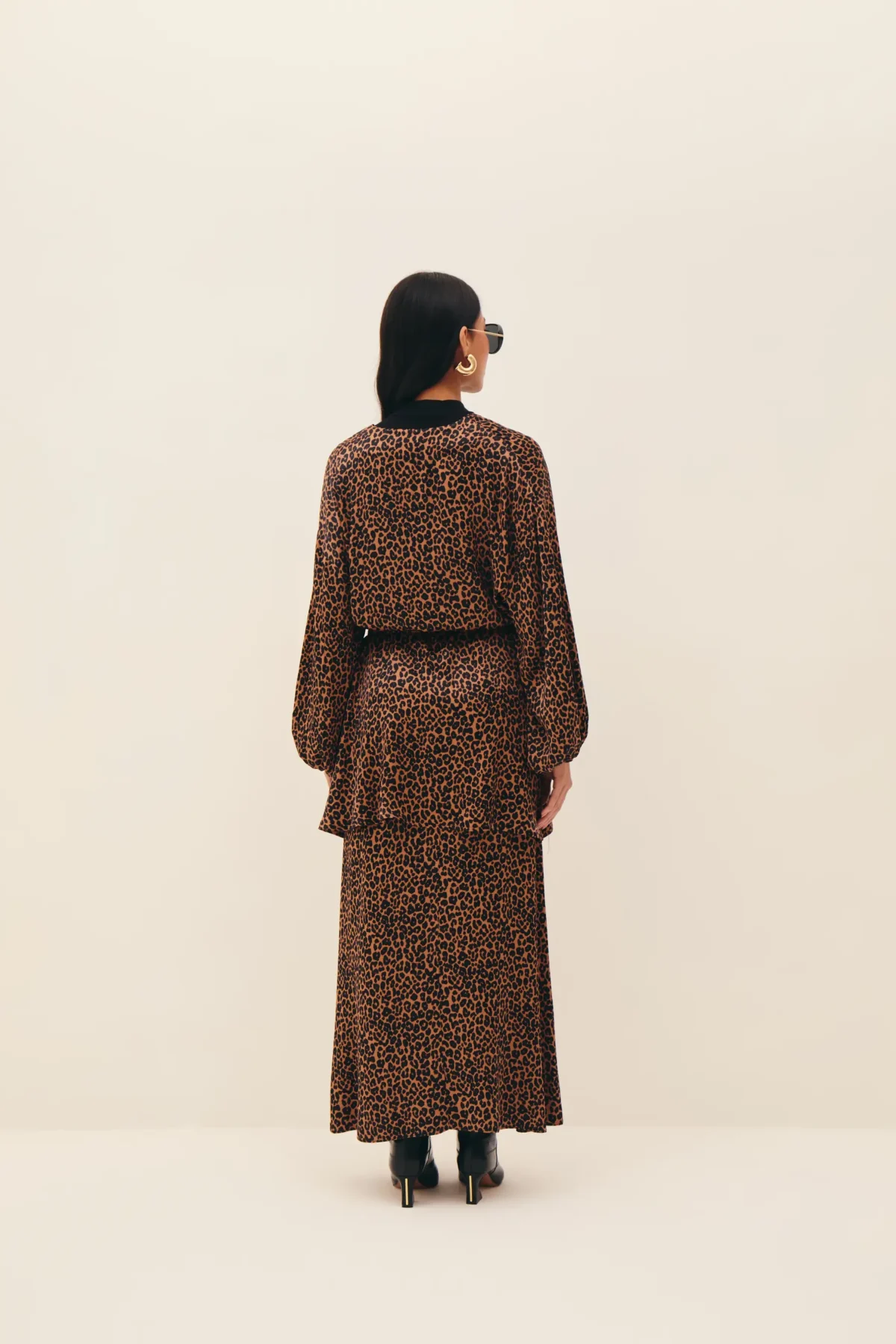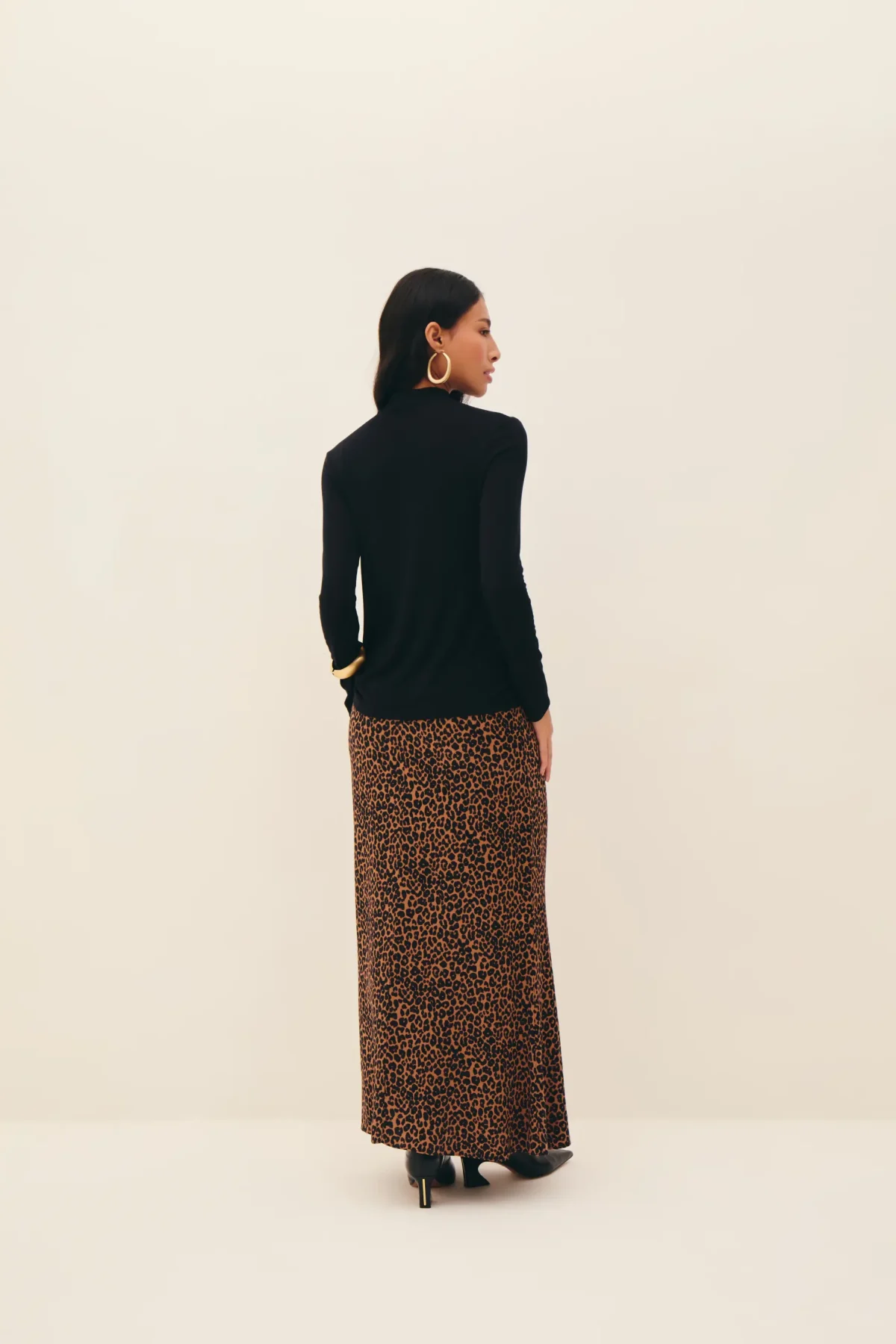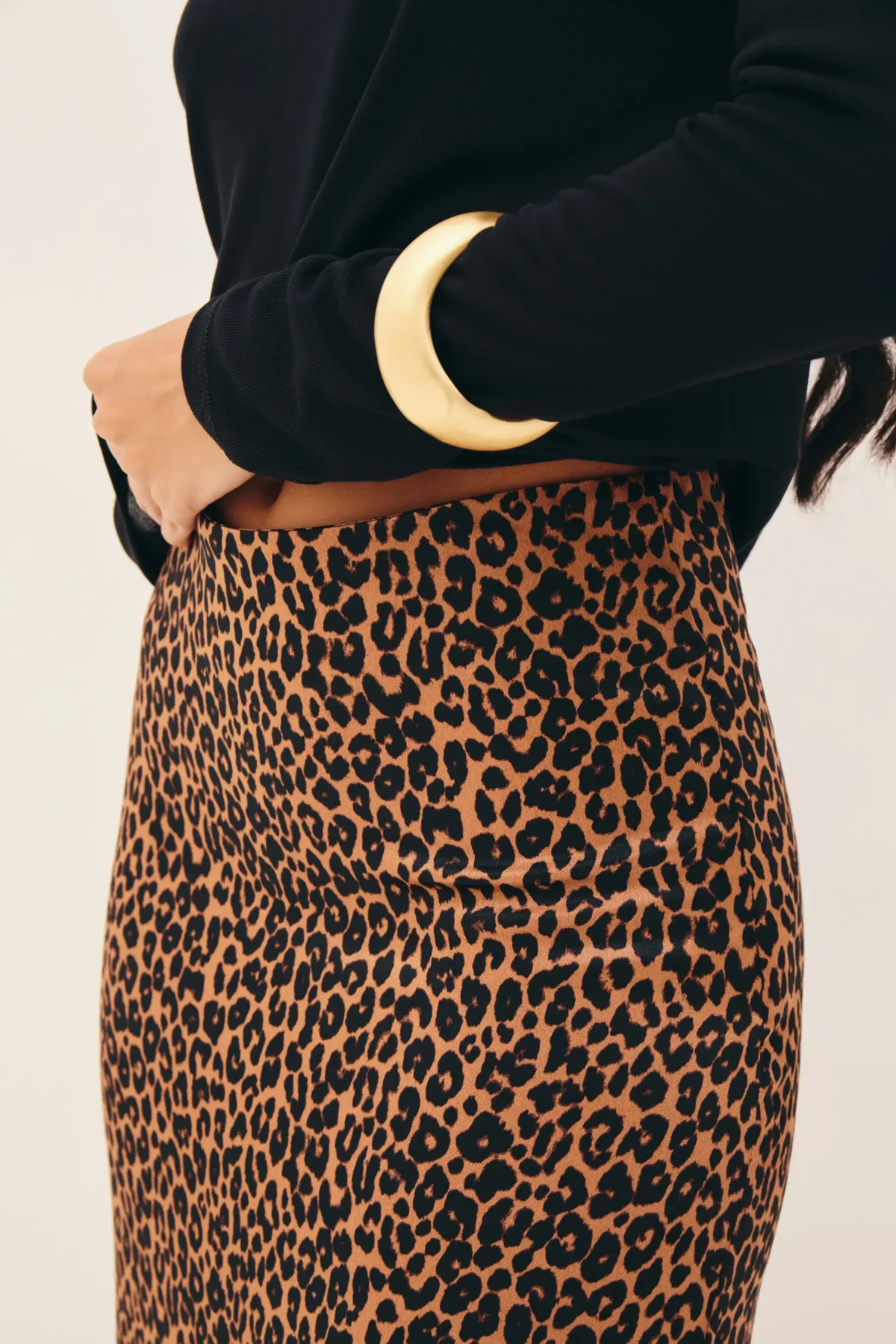 Saia em cetim de viscose com padronagem de onça, comprimento longo, cintura intermediária, corte enviesado com quadril ajustado e barra levemente ampla, fechamento por zíper invisível atrás.