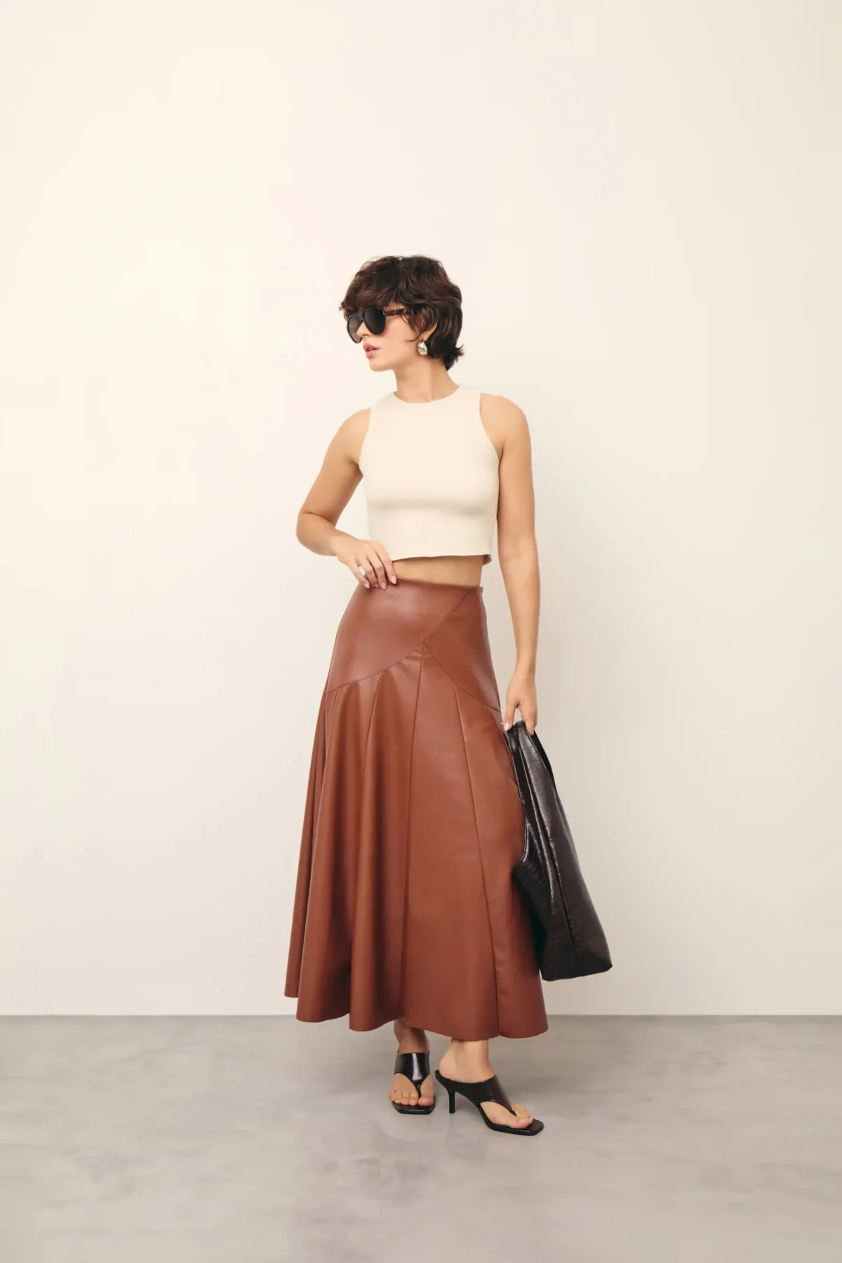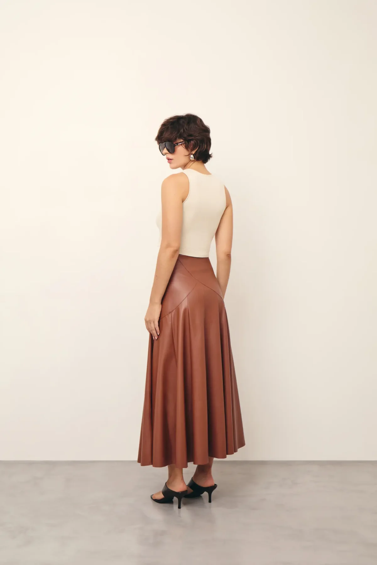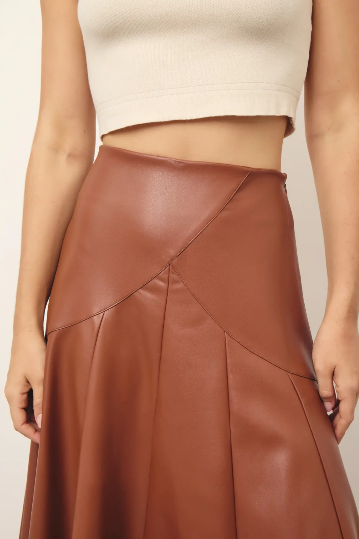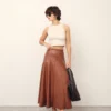 Saia em couro ecológico com corte evasê, cintura alta com fechamento por zíper invisível lateral, pala larga com corte assimétrico arredondado, pregas largas que proporcionam volume estruturado e comprimento longuete.