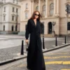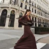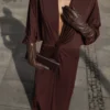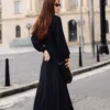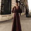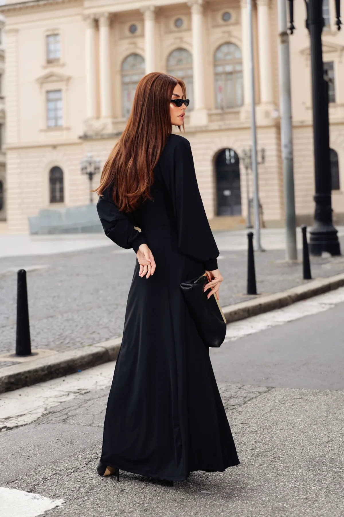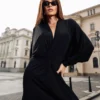 Vestido em malha poliamida com comprimento longo, corte amplo, mangas longas amplas com punhos ajustados, decote frontal profundo com detalhe torcido.