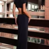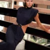 Vestido em malha poliamida com comprimento longo, gola alta franzida, ombros estruturados por ombreiras, recorte cavado na cintura com passador em metal banhado a ouro, detalhe frontal franzido e decote aberto atrás.