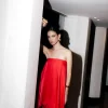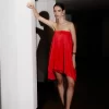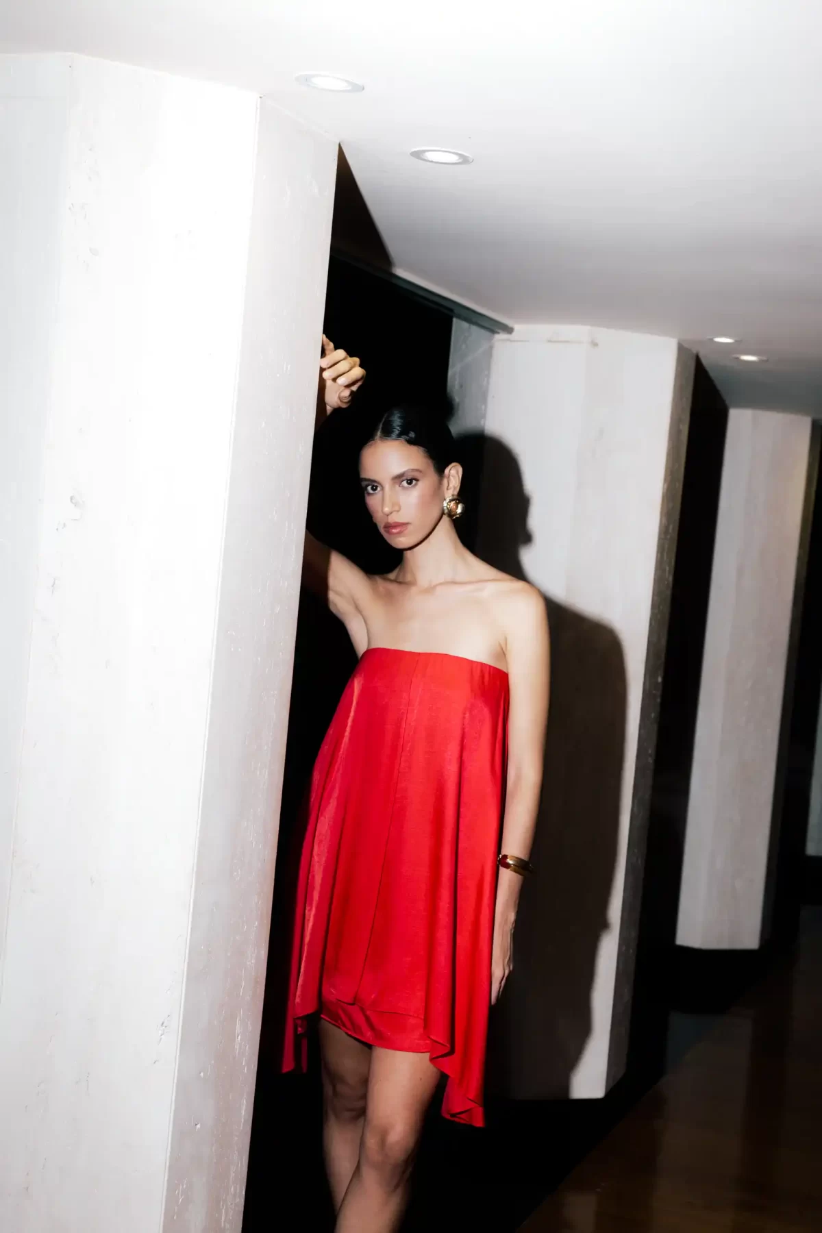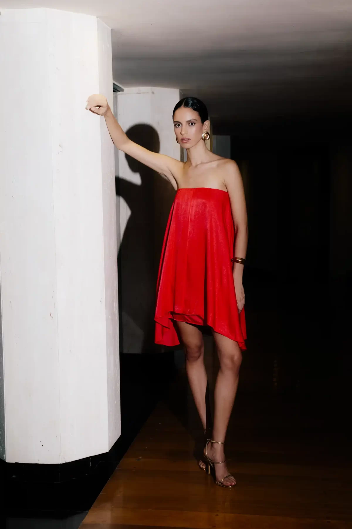 Vestido em cetim de viscose com decote tomara-que-caia com fita interna de silicone para fixação da peça ao corpo, corte amplo enviesado com barra irregular, leve drapeado, fechamento por zíper invisível atrás e tira interna de elástico largo com fechamento por colchetes para melhor ajuste da peça ao corpo.